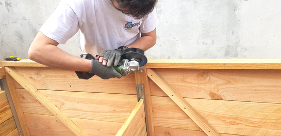 Nous avons également sécurisé les composteurs avec un grillage pour limiter l’accès des nuisibles. Il est important de rester précautionneux : prévoir une surface bien agencée, lavable, avec de bonnes pentes et des retours appropriés pour pouvoir remplacer le bois lorsqu’il s’abîme.